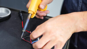 配線を結線する場合は必ずハンダ付けで行なう。ハンダ使用量は最小限になっており、耐久性も期待できる。また隠した時には、純正配線のような細さになるようなステルステクニックも見て取れる。
