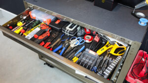 ツールキャビネットには、引き出しごとにセキュリティやオーディオにインストールする際に必要な工具が整然と並べられている。こうした細かなこだわりのひとつひとつが効率的かつ確実な作業に直結する。
