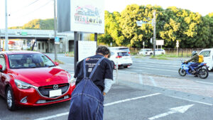お客さんのクルマが見えなくなるまで見送るのが大塚さんのスタイル。独立前から「当たり前だと思ってずっとやっています」と言う。この誠実さはインストール作業にも反映される。