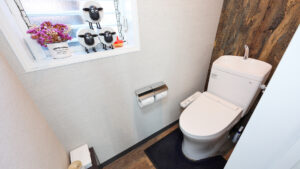 大塚さんのこだわりのひとつがお手洗い。家族や女性だけで来ても使いやすいよう、あえて商談スペースからは離れた場所に設置。清掃も行き届いており、気持ちよく使用することができる。