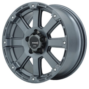 こちらもタイヤエイトオリジナルカラーのグロスブラックと、マットグレイガンメタをまとったホイール。迫力ある極太スポークはリフトアップしたD:5や、オフロードタイヤにも負けないワイルドさがある。センターキャップも専用カラーだ。