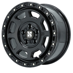 タイヤエイトオリジナルカラーのグロスブラックの「XJ07」。平座を採用しておりD:5純正ナットが使用できる。センターディッシュフェイスとピアスボルトのリムで強い存在感をアピール。サイズは16×7J+33。