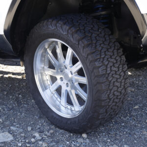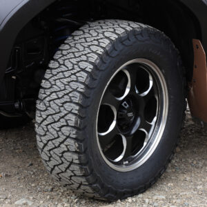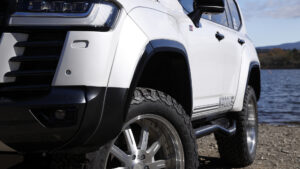 オーバフェンダーを装着したことで、タイヤサイズは295/60R20に変更。軽さも追求したブラッドストックSLを組み合わせる。タイヤの大径化で増加しがちなバネ下荷重を軽量ホイールでバランスを取る。