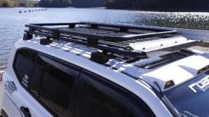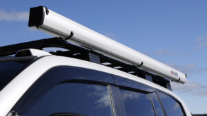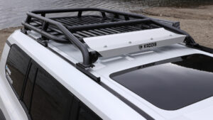 屋根全体を覆い尽くすようなサイズの、ルーフキャリアを装着。ARBのサイドオーニングをマウントするなど、積載性はもちろん拡張性が高いこともポイントだ。
