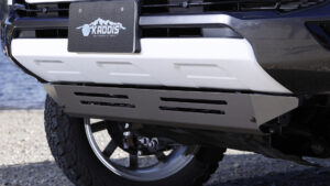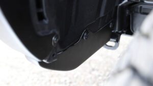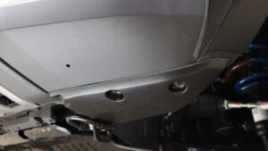 ボディアップマウントにともない装着するフロントのアンダーパネル。そのままではエンジン本体や補器類が見えてしまうので、スチール製のガードで保護する。