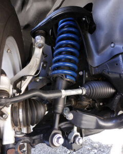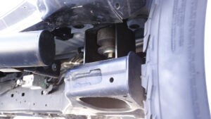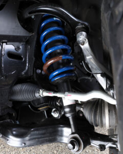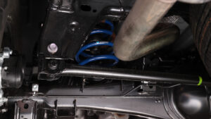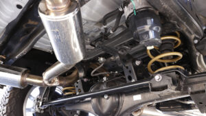 前後ともオリジナルのコイルスプリングに変更し、2インチのリフトアップを実現。実用新案登録済みのラテラルダウンブラケットを使用し、ノーマルのラテラルロッドを理想的な角度でセットする。偏心ボルトで左右の調整も可能。