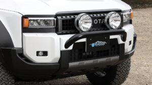かつては金属製のグリルガードが主流だったが、クルマの先端に重量物を搭載すると回頭性が悪化してしまう。そこで軽量な樹脂製とすることで、ハンドリングの悪化を防止。ミリ波レーダーに干渉しない形状で、取り付け位置も考慮されているのは言うまでもない。