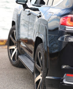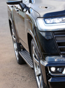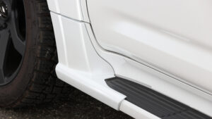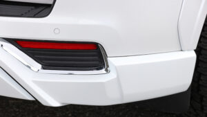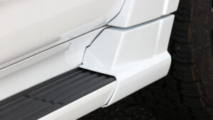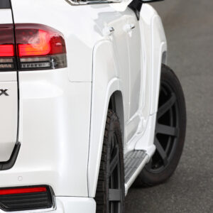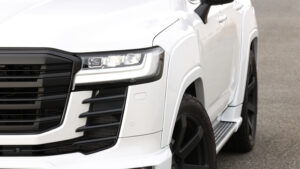 今回紹介する2台のランクル300は、基本的にオーバーフェンダー以外は同じエアロパーツを装着している。ブラックの車両は構造変更が不要な9㎜ワイドで、サイドステップはノーマルのまま。それに対してホワイトの車両は35㎜ワイドを装着。一般的なエアロはフェンダーとステップのラインが断絶されるが、KUHLではサイドステップの前端と後端にボディラインと繋がるカバーを追加。これにより、フロントからリアにまで一貫した美しいスタイリングを実現したと言えるだろう。