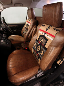 運転席&助手席にはPENDLETON(ペンドルトン)とフレックス・ドリームがコラボしたFD campのオシャレなネイティブ柄のシートカバーを装着。機能性とカラーコーデを実現。