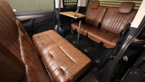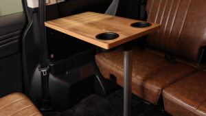 車体無加工で装着できるテーブルをセット。脚を折りたたむことでコンパクトに収納可能。またセカンドシートの横にもドリンクホルダー付きセンターテーブルがオプションで装備可能。