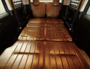 このD:5最大のポイントがインテリア。新作のMONOBOX製Diシートをセカンドシートに換装し、前向き・後ろ向き・フラットという3パターンにシートアレンジできる。しかも純正シートレールに対応し、車体無加工での装着が可能となるまさに神アイテム。新型デリカで車中泊をするユーザーには定番となること間違いない。