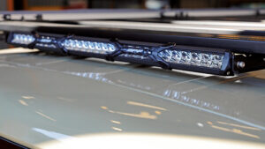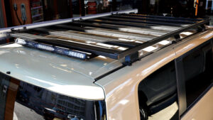 荷物の拡張性を高められる人気アイテムのルーフラックもIPF製を装着。専用レッグで装着しロープロファイルのルックスは見た目もスマート。Tスロットにアクセサリーを装着することでさまざまな積載に対応する拡張性を誇る。ルーフラックやフェンダー、ピラー下にはIPF製LEDオクタゴンランプやバーライトも装着。