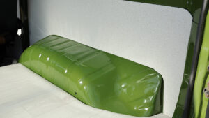 インテリアパネルはホワイト系で作り直し、まるでデザイナーズマンションかカフェのような雰囲気に。こうしたセンスは浦川氏をはじめスタッフで話し合って決めているという。また内装もすべて鈑金したのち防錆処理をすることで錆の心配もない。