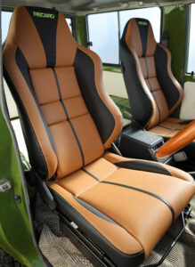 シートはレカロ製に換装。さらに外装とマッチするようにブラウンに張り替えている。ステッチもグリーンとすることで外装とマッチさせている。またフロアはファブリックに張り替えており、レトロ感も演出するなどオシャレなインテリアとなっている。