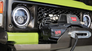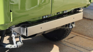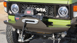 バンパーは前後ともスチールでワンオフされている。フロントバンパーにはWARNのウインチも搭載される。またカラーも変えており、リアバンパーはフレームと同色で一体感を演出。フロントはグリルよりも明るくして軽快なイメージにしている。