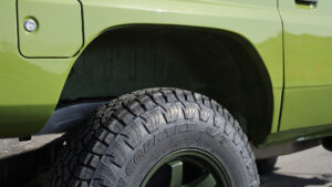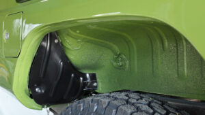 非常に凝った作り込みがなされたフロントフェンダー。アウターパネルを大きくカットしハイフェンダ—に。インナーパネルは鈑金で作っている。またリアフェンダーもアーチを大きくカット。今後36インチクラスの大径タイヤの装着を見据えた加工なのだ。