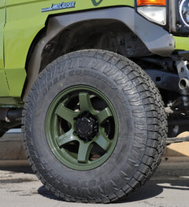 ベース車は平成7年式のLX。ショートボディ、デフロック、サンルーフ付きのレアな個体となる。なおこうしたレア車体を積極的に仕入れるのも同社のコダワリのひとつ。最終的に販売価格が高くなっても、分かる人に乗ってほしいという想いがあるからだろう。さて70だが、最終的な姿は街でも映える本格オフローダーとのこと。今後は36インチタイヤにする予定だが、現在はオープンカントリーA/TⅢの225/95R16というマニアックなサイズ。ホイールは浦川さんが好んで使うというレイズのグラムライツ57DR‐Xだ。フェンダーは大径化をした際にパイプフェンダー化するつもりだが、現状はフェンダーをカットしてインナーフェンダーを鈑金で製作。大径タイヤをストロークさせるための前準備なのだ。さらにリアフェンダーやリアクオーターパネルも大幅にカット。切りっぱなしではなく上質感を演出するように鈑金でつないでいるのも見事というほかない。