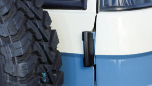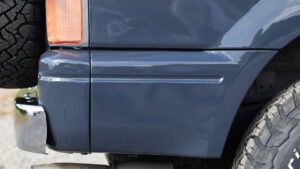 こちらの78プラドは、ベース車両からファーストサインが探してカスタマイズしたモデルとなる。ポイントはナローボディ化とカラーリング。純正のナローは市場ではほとんど出回っていない希少な個体。そのレトロかつシンプルなスタイリングのナローボディを、スムージングすることで再現。鈑金も経年でパテが痩せないよう、裏に当て板をするなど技術を駆使して行なっている。またカラーリングもこだわりの3トーン。ホワイトは、色番号すらないオールドボルボのボーンホワイトを再現している。