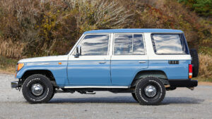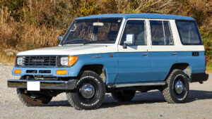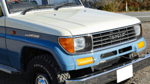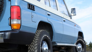 いっぽう左の78プラドは外装だけでなく、内装も含めてカスタムが施されている。外装についてはナローボディ化を行ないシンプルなレトロ感を実現。ボディカラーはスモーキーブルーをベースとしつつ、ルーフとサイドをボーンホワイトにペイントした3トーンとしてオリジナリティを演出。内装もボディカラーに合わせてグレー系のシートカバーを装着するなど、スタイリッシュに仕立てている。