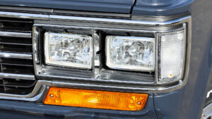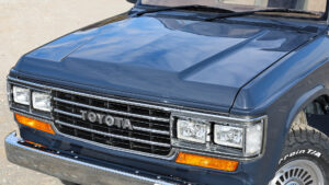 ランドクルーザー60の角目仕様に変更されたフロントフェイス。交換されるのはフロントフェンダーとボンネット。キット販売ではなく車両を預かって加工装着が必要となる。グリルは60の純正を使用しているのもポイント。このグリルを装着するために95純正の位置よりもグリルは前側に移設されており、そこに合わせてステーとフェンダーを設計しているという。なお丸目バージョンにすることも可能とのこと。