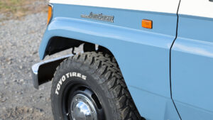 78プラドのルックスを際立たせるのが、現行の250にも採用されるスモーキーブルーとボーンホワイトの3トーンのカラー。純正に存在しないカラーリングでもファーストサインなら対応してくれる。また経年劣化したパーツは交換や補修を行ない、できる限り新車の状態に近づけるなど、手間と時間をかけてカスタマイズを行なっているのもポイント。ホイールはボディカラーに合わせ、クラシックホイールを選択しペイント。タイヤはオシャレ系ユーザー必携のオープンカントリーM/Tをチョイスするなど、全体のトータルコーディネイトも考えて作り上げられている。