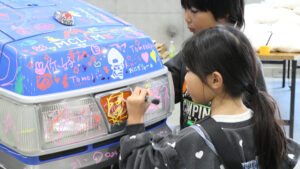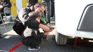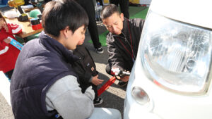 目の前でカスタムカーの製作を行なったり、ヘッドライトのコーティング作業も実施。キッ○ニアじゃないけど、キッズがタイヤ交換に挑戦できるメニューもあり、老若男女が大いに楽しんでいた。