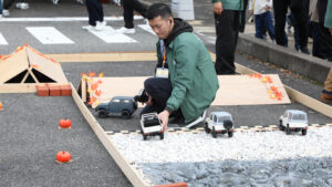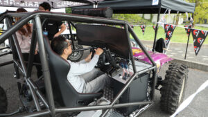 津田レーシングの協賛で実現したのが、リアルなオフロード走行シミュレーター。またRAYWOODの協力で実現したのが、8m×10mという広いエリアに構築したラジコンのオフロードコース。
