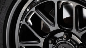 リム外周部に設けられたボルト状のホールも、グロスブラックのカラーリングが醸し出す高級感に磨きをかけている。またディスク面にコンケイブデザインを採用することで、奥行きのある立体感をより強調。また、ホールデザインの内側の一部に切削加工を施すことで、シルバーのアクセントカラーを与えている。その切削によって絶妙なデザインバランスが演出されることで、ヒューロンらしさを演出している。