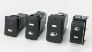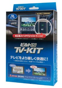 走行中も同乗者のテレビ視聴を可能にするデータシステムのTV-KIT。定番アイテムだが、いくつかのタイプが用意されている。スタンダードな切り替えタイプは付属のボタンを使ってテレビ視聴の制御を切り替えることができる、一方のビルトインタイプは純正風のスイッチを使って制御の切り替えができるモデル。デリカD:5に適合するビルトインスイッチも用意する。