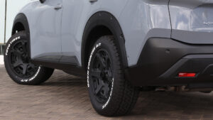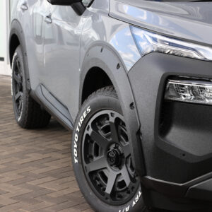 またタフボーイはカスタムした特別仕様車ですが、カスタムする上で最も気をつけたのは、ノーマルの良さを崩さないこと。そう、あくまで新車ディーラーで購入する車両だということです。タイヤも荒々しいパターンのものに交換すれば見違えるほどたくましくなりますが、乗り心地やノイズが気になってしまうはず。そこでエムクライムのユーザー様と奈良日産に来店されるお客様の違いを明確に意識し、装着するタイヤには上質な乗り味を損なわないA/T(オールテレーン)タイヤを選びました。またノーマルのサイズは18か19インチですが、アウトドアユースやクルマのバランスを考慮し、18インチのMGホイールを組み合わせています。そこにSUVらしさをより高めるJAOS製フェンダーガーニッシュを追加しました。