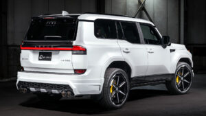 フロント以上に、立地感を強調したリアハーフスポイラー。中央部分にはスキッドプレート風のデザインを採用することで、オフロードカーらしい印象もしっかり確保。フロントにも採用するが、サイド部分にはフラップも追加されており、高級車に相応しい造形を実現する。なお単品よりもリーズナブルな前後セットも設定する。