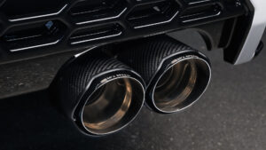 ハーフスポイラーとのマッチングを考慮した、左右4本出しのエキゾーストシステム。保安基準に適合するだけでなく、スペアタイヤを残したまま装着が可能。写真のカーボンテール仕様の他に、ステンレステール仕様も設定する。絶妙なマッチングは、同一ブランドだから成せる技だ。