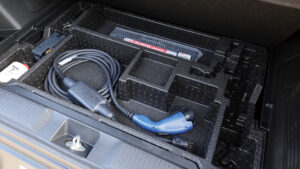 充電ポートはフロント右フェンダー上に設置。車両に付属する充電ケーブルをラゲッジ床下に備えているので、自宅や充電スポットで簡単に充電が可能。充電はバッテリー温度や電力残量、充電環境などの条件にもよるが、急速充電で約45分(Z)。普通充電で約10.5時間(Z)となっている。