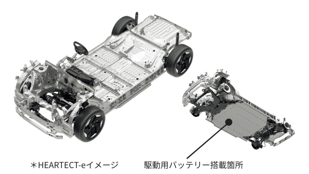 EV専用のプラットフォーム「HEARTECT-e」を新開発したことでロングホイールベース化による大型駆動用バッテリーの搭載が可能となるほか走行安定性も向上。タイヤもSUVらしい18インチの大径のタイヤの装着が可能となる。さらにスアリングの切れ角も大きくとれることで最小回転半径は5.2mという取り回し性能を実現。高ハイテン材の使用率も高く、軽量化高剛性のフレームとなっている。