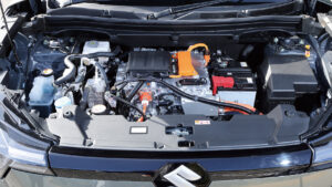 フロントには制御ユニットなどを搭載。一般的に寒冷地が苦手なBEVだが、eビターラにはバッテリーウォーマー機能や走行中のバッテリー昇温機能を備える。
