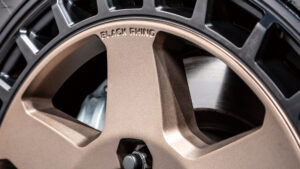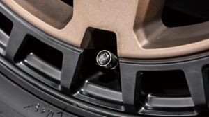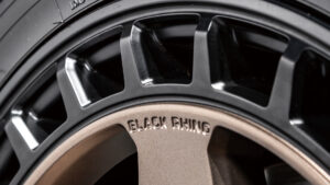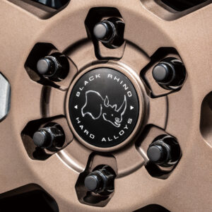 ビードロック風ではなく、貫通式のスクエアウインドーを連ねたマルチホールリングを採用。ディスクスポークとアウター側のショートスポークが交差することで、力強くメリハリのある造形を生み出している。これはデザイン性だけでなく、冷却性能にも優れた実用的な構造だ。さらに、バルブ周辺のスペースを広く確保し、エア調整のしやすさにも配慮。基本デザインは極太の6スポークだが、逆反りのコンケイブ形状を取り入れることで、タフでワイルドな印象を強調。スポークエンドはリムまでしっかりと伸び、幅広に設計されており、剛性と力強さを両立。センターキャップやバルブには、ブラック・ライノの象徴であるクロサイのモチーフをあしらい、ブランドの個性を主張している。