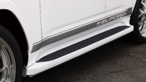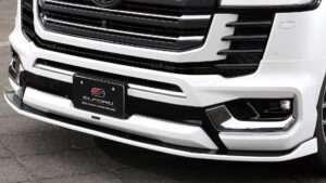 新車の購入時にしか発注できないメーカーオプションのエアロ。しかし、周りを見渡せば同じ仕様の車両がたくさんあって逆に没個性になってしまうことも。さらにカスタムするには外す必要があるが、せっかく付けたのに外すなんて…と悩む人は多い。そんなユーザーに救いの手を差し伸べたのがエルフォード。純正エアロの下に追加するフロントアンダーウイングは、ハーフスポイラーと比べてコンパクトだが立体感を強調したデザインで、存在感は極めて強い。さらにリアスカートエクステンションやサイドステップエクステンションも装着すれば、フロント〜サイド〜リヤへと繋がるラインが美しい。