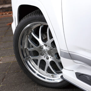 大口径な24インチサイズのエルフォードのホイール・セレスティアル。大径に替えたら重量増で燃費やブレーキ性能が悪化した…といった不満を解消すべく、ノーマルタイヤ&ホイールより軽量化を追求する…というコンセプトで誕生したのがセレスティアル。鍛造製法により軽さと剛性を両立し、TPWSにも対応。また独自機構のアンチエアリークシステムで、スローパンクチャーを予防する。