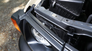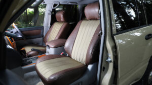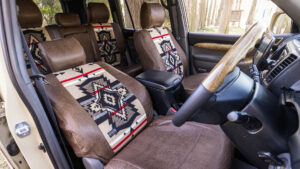 MONOBOXのフェイスキットを使用し、クラシックな雰囲気に一変。かつてはメッキのドアハンドルやボディ同色バンパーが好まれたが、近年の4WDのアイコンとなるのは未塗装樹脂パーツ。そこでバンパーやドアハンドルはマットブラックにペイントし、ワークホース的な雰囲気を醸し出している。ホイールも無闇と大口径を履かず、タイヤも比較的細身をチョイス。ルーフラックやオーニングなど最小限のパーツを追加し、シンプルな印象を与える。ボディ色に合わせたシートカバーも装着し、これぞトータルコーディネイトと言うべき仕上がりだ。