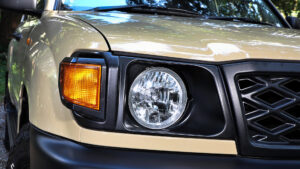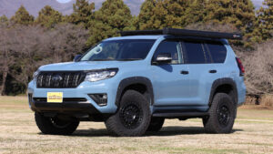 前期モデルのショートは丸目ヘッドライトが標準装備だったので、非常に違和感のないスタイル。また一部グレードにナローも設定されていたが非常に個体数は少ない。そこでオーバーフェンダーレスにし、細身のタイヤを装着。アース系のボディカラー&マットブラックを組み合わせるだけで、90系のプラドが、まるで違うクルマのように見える。