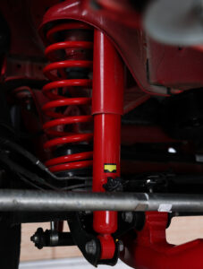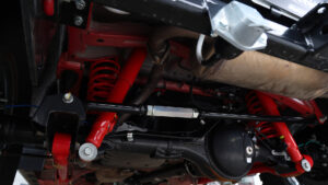 今回の取材車両が装着していたサスペンションは、オプションとなるHB1st製の3インチアップキット。これは本格的なオフロード走行も考えたセレクトだ。通常のエヌズ・リミテッドのスタンダード仕様ではJAOS製のバトルズサスペンションキットで40㎜の車高アップを敢行している。タイヤサイズや実際に乗るユーザーにもよるが、普段使いを考えるとリフトアップ量は40㎜くらいが使いやすいとのこと。もちろん車高アップに伴う補正もバッチリ行なわれており、カスタムカービギナーでも安心して乗ることできる。