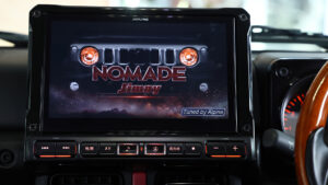 カーナビはアルパインの10インチBIG-Xを装着。ノマド専用のオープニングがオーナーの心をくすぐってくれる。さらに話題のメティオサウンドなどのインストールも可能。