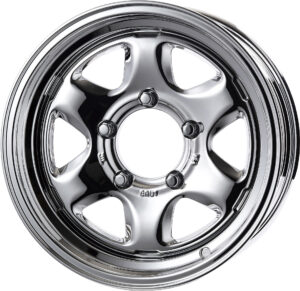 5ドアジムニーのノマドJC74が投入されてから、相乗的にさらに人気を加速しているJB74シエラ。ノマドもシエラも最新の本格四駆だが、原点回帰したクラシカルな装いもあって、カスタムシーンではバラエティに富んだメイクが施されている。要はモダンにもレトロにも振れるのが魅力だ。ここで紹介する『BRUT(ブルート)』は、クラシカルホイールの佇まいで、『BR‐44』にノマド・シエラ専用の16×6.5J±0サイズを持つボトムスだ。もちろんBR‐44の最大の特徴は〝ネオクラシック〟。往年のスチールホイールをオマージュしてデザインされ、アールを取り込んだ緩やかな造形や絶妙なスポークの幅、長さによって、懐かしくも新鮮な6スポークを演出している。さらに、スポークとリムフランジが交差するリムエンドに凹んだ意匠を与えているのだ。