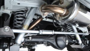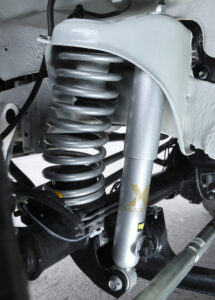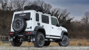 サスペンションは、ジムニーノマド専用に開発されたジャオス製バトルズのリフトアップセット。車高アップは40㎜アップとなり、乗降性も走行性能も高められているかっ。コイルスプリングはヘタリ保証付きで、あわせたAJダンパーは14段階の減衰力調整式、低圧ガス式ツインチューブダンパーとなり、ノマドの走りをサポートする。