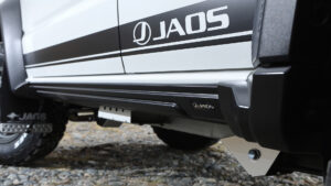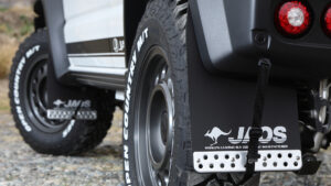 JAOSスポーツカウルに変更した前後バンパー。素材は自動車メーカーが採用するレベルの高品質なウレタン樹脂。適度な柔軟性があり、耐衝撃性に優れている。またスポーツカウル専用のスキッドプレートやフロントグリルも追加してスポーティに!リヤスポーツカウルは開発中だが、ほぼ完成に近い状況だった。またジャオスの定番パーツといえばマッドガードだが、近年はユーザーの装着率が相当に高い印象だ。