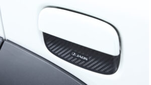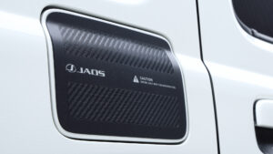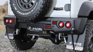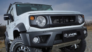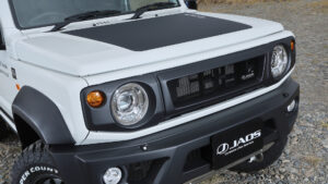 無骨なレンコンタイプのホイール『TRIBE(トライブ)』のジムニーノマドJC74&ジムニーシエラJB74用を追加するなど、急ピッチでノマドに対応する各パーツを設定している『JAOS(ジャオス)』。シンプルながら本格クロカンらしさをブラッシュアップするパーツが用意されるが、中でも注目なのはフロントのスポーツカウル。スチールバンパーのような堅牢さと、細部に造形を与えたレーシーな装いの樹脂バンパーで、ノマドをダートランナー風に変貌させる。それと対を成すリヤスポーツカウルももちろん設定されるが、撮影時はまだ試作品を装着。リリースが待たれるアイテムといえよう。