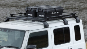ほかにも機能系パーツのBATTLEZシリーズのサスペンションをノマドに設定。リフトアップ量は40㎜と控えめなようにも思えるが、ノマドにはこれがベストバランス!さらに減衰力14段調整式の高性能ダンパーをセットすることで、走りや乗り心地を劇的に向上させている。また5ドアロングのノマドにもフラットラックの装着を確認済み。デモカーには、1250×1400㎜サイズでレインレール(雨どい)に強固に固定するタイプBが搭載し、ノマドでもJAOSスタイルがほぼ完成したと言える状況だ。見た目のみならず、機能性と実用性をアップデートするJAOSスタイルは、まさにジムニーノマドカスタムの王道と言っても過言ではない。
