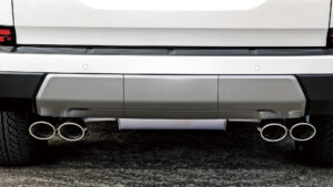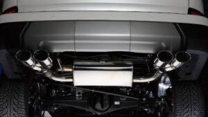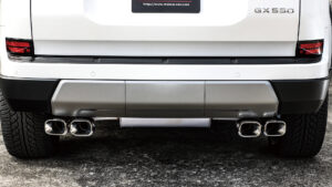 GX550のシャープなエクステリアを際立たせるスプリット4本出しマフラーTYPE-Xをセット。これは120㎜×85㎜のスクエア形状のデュアルテールを左右にレイアウトしたもので、リヤバンパーの下に4つ並ぶテールは圧巻。レクサスの上品さに野生味を加えてくれる。なお、大型のサイレンサーを設置するため、床下にセットされているスペアタイヤを外すことで自由度の高いマフラーレイアウトを構築。タイコから左右にフィニッシャーを配置して排気効率を高めながら、4本全てのテールピースからエキゾーストを排出。ノーマルと異なる存在感やスポーティな走りが楽しめるのは大きなメリット。排気効率とレスポンスにも効果アリだ。
