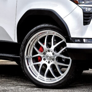 エルフォードの大口径24インチサイズのホイール・セレスティアル。重量級のレクサスGX550やランクル250の足元を支えるために、強度や剛性は必要不可欠だが、加速や燃費、ブレーキ性能の悪化を防ぐには軽さも追求する必要がある。この相反する機能を実現させるために鍛造1ピース構造を採用し、ノーマルタイヤ&ホイールより軽量化を追求するコンセプトで誕生した国産ホイールだ。