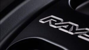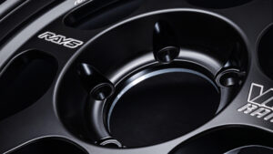 特許技術であるA.M.T.によってスポークに「RAYS」と「VOLK RACING」のロゴを刻印。艶消しブラッククリアを重ねることで上品な輝きを放ち、独自のアクセントが施されている。